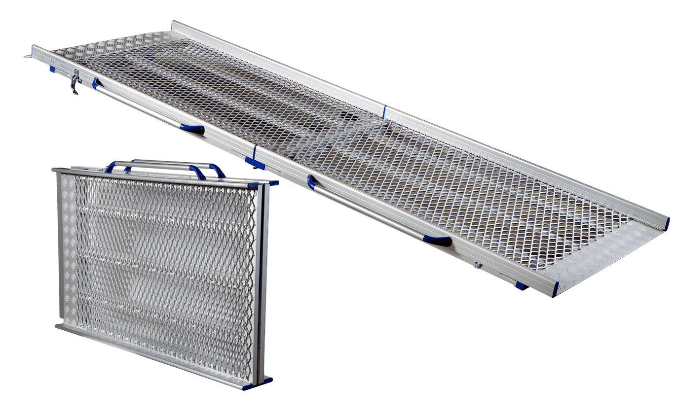 Kevytet ja kestävät taittorampit kuljetuksiin. Verkkopinta tuo pitoa ja keveyttä. Rampeissa on kestävä leveä sarana, 5 cm:n reunat ja kantokahvat.